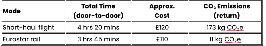 The Eurostar train takes 3hrs 45mins (door-to-door), costs £110 and emits 11kg CO2e.